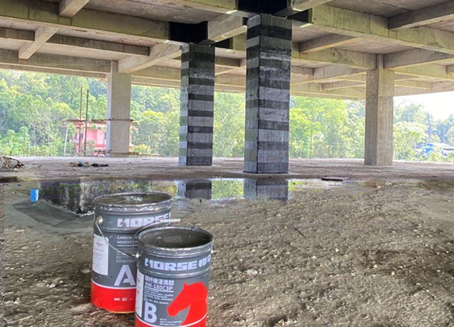 The cosmetic layer, oil, dirt etc. Of concrete surface should be chiseled off and then rubbed off 1 ~2 mm thick surface layer with the angle grinder, concrete components should be handled by chamfering on the corner, dust was blew out with compressed air after the completion Of polishing, and finally the surface was wiped by cotton cloth dipped in acetone, and kept dry for use. If the concrete needed to strengthen existed cracks, first choose HM-120M perfusion adhesive or HM-120L pouring crack adhesive to perfuse according to the size of crack, and then strengthen.